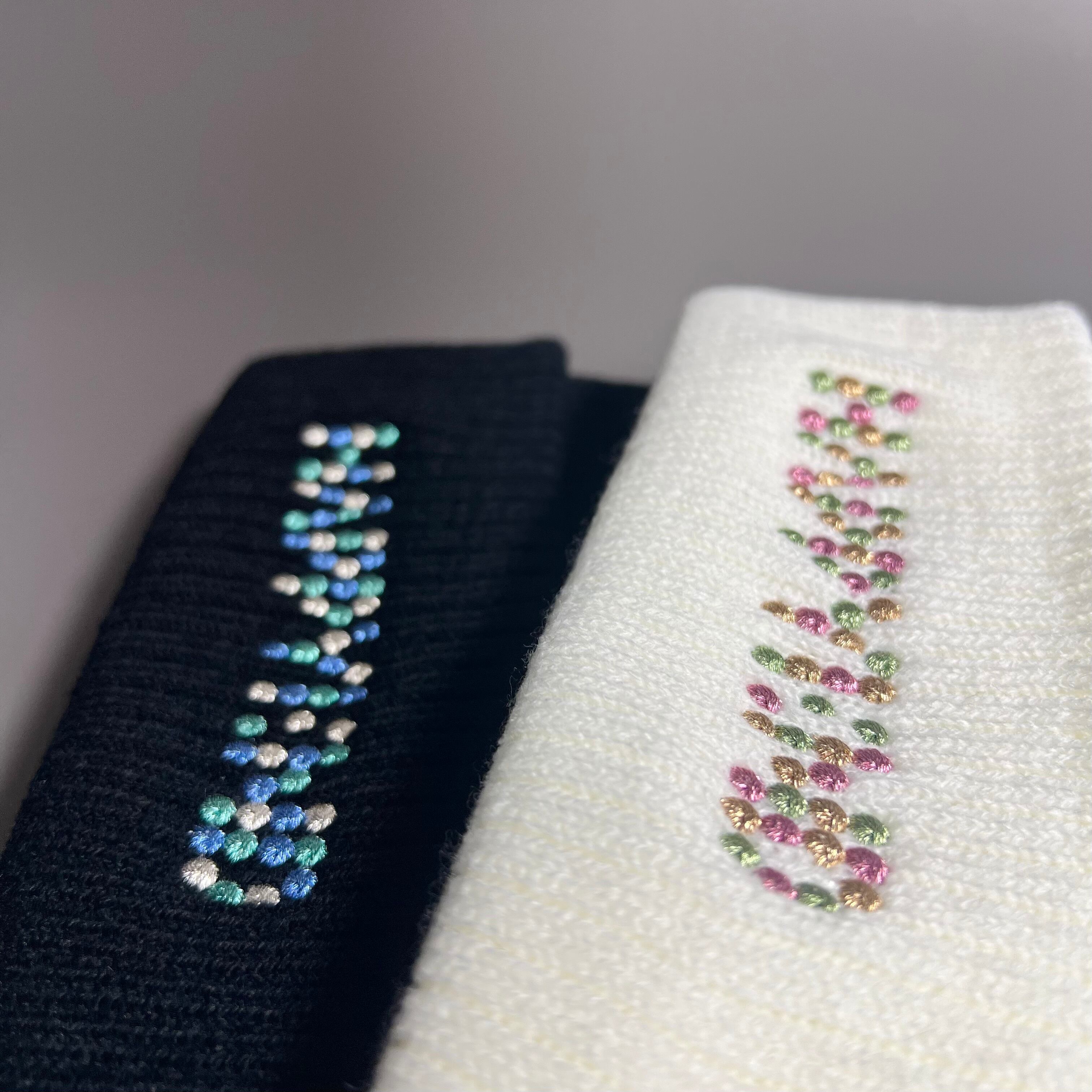 アイボリー・ブラックそれぞれ3色のラメ糸で刺繍を施しており、光が当たるとキラキラします。